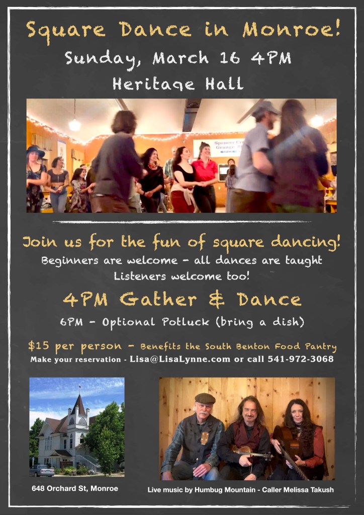 Sunday, March 16 – 4PM Square Dance at Heritage Hall, and our Old-time trio will be making the music- Make your reservation with me.